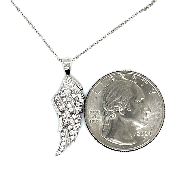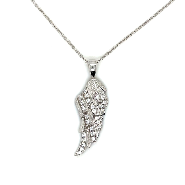 925 sterling silver with rhodium plating and cubic zirconia angel wing necklace. Comes with an adjustable 16″ to an 18″ chain.