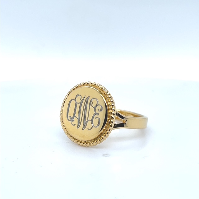 Handmade 925 sterling silver with gold plating engravable ring with rope border.  Available in sizes 4, 5, 6, 7, 8, 9 and 10.  Engraving charge is $5.00.